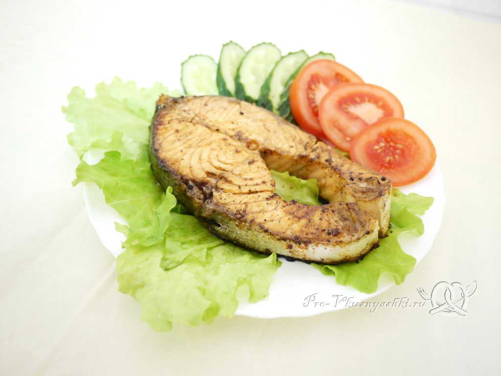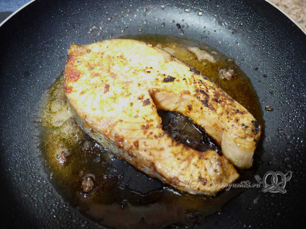 - Обжарить стейк примерно 10 минут до толщины 2–2,5 см, по истечении половины времени перевернуть рыбу.