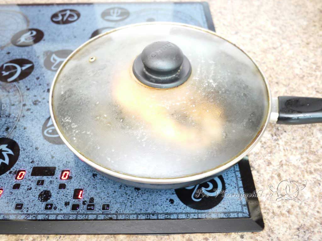 Когда стейк подрумянится с обеих сторон, сковороду накрываем крышкой, убавляем огонь до минимального и томим нашу рыбку еще 5 мин до готовности.