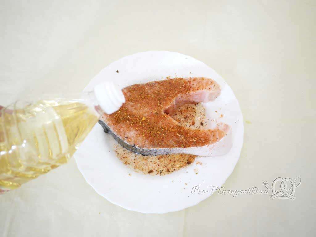 - Смажьте рыбный стейк оливковым маслом. Нет необходимости добавлять соль и перец.