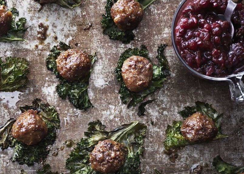 - Теперь дело осталось за малым: капустные чипсы выложите на блюдо. На каждую чипсину положите фрикадельку в глазури. Подавать блюдо нужно с брусничным соусом.