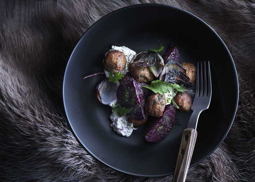 Мясные фрикадельки со сметанным соусом, обжаренным красным луком и запеченной в соли свеклой
