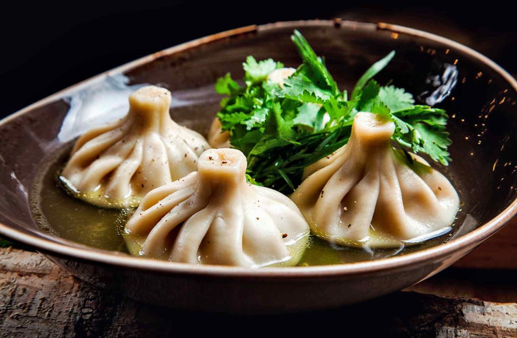 56. Подаём хинкали по-грузински с толчёным в соли чесноком.