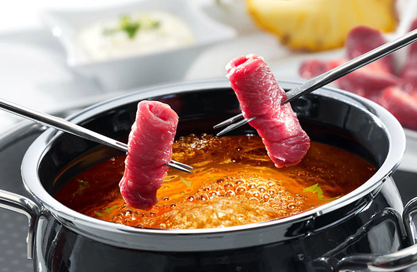 Как правило, в комплекте к котелку идут специальные вилочки, а сама фондюшница стоит на высоких металлических ножках.