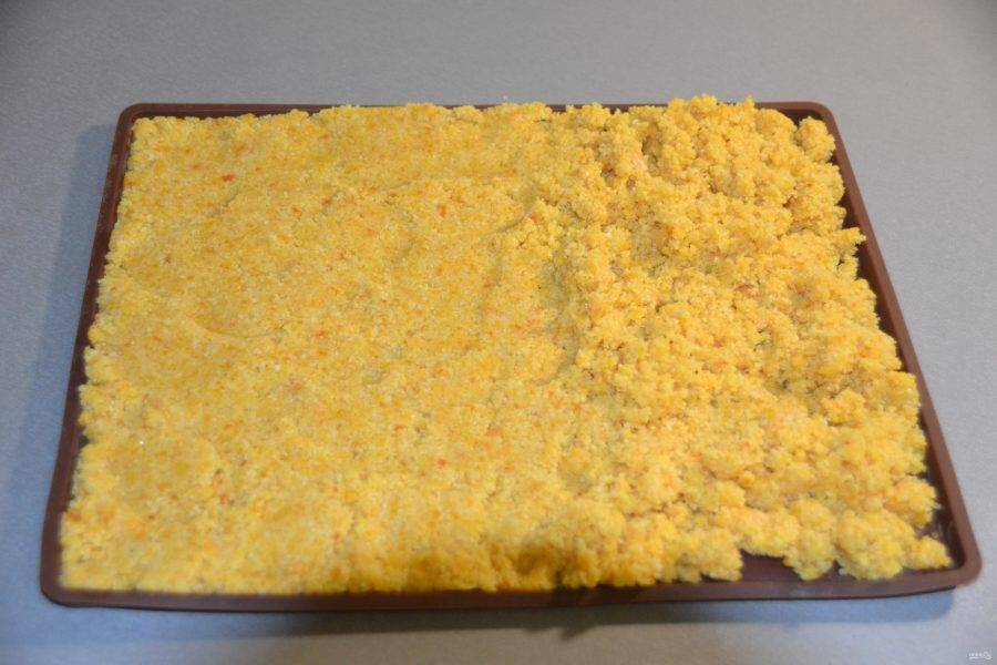 Выложите миндальную смесь на противень с бортиками и начинайте плотно утрамбовывать.