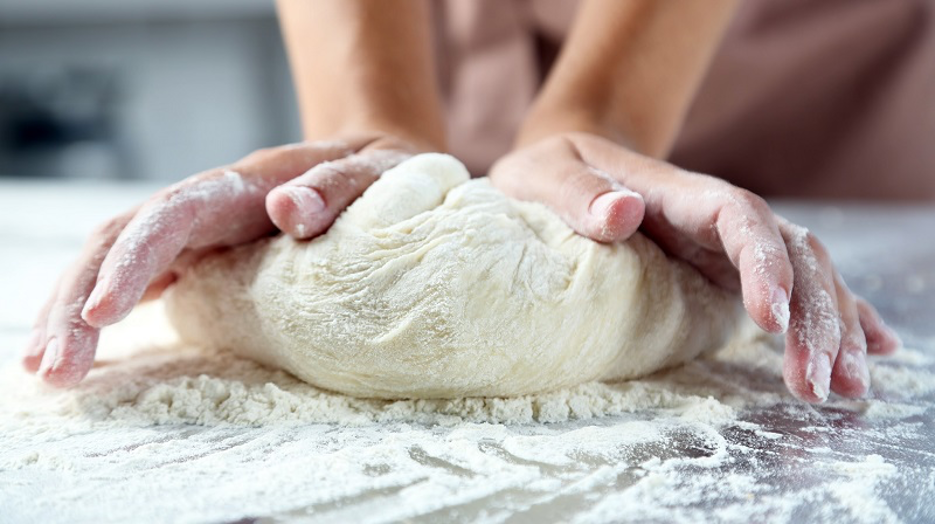 - Присыпаем рабочий стол небольшим количеством муки, продолжаем вымешивать тесто руками до эластичности.