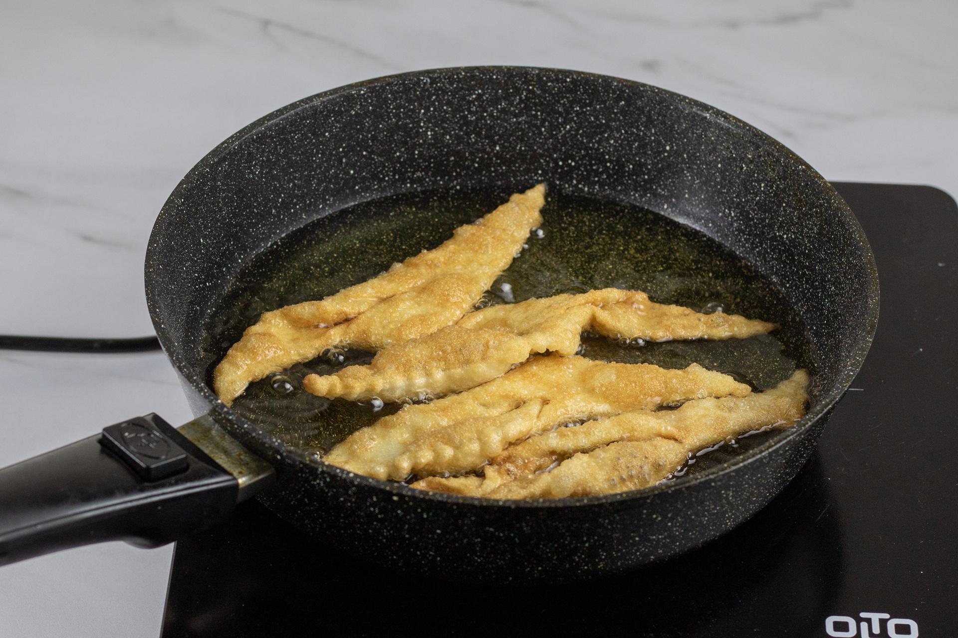 - По этому простому классическому рецепту готовим полоски из теста с двух сторон до появления румяной корочки. От плиты не отходим, потому что лакомство жарится очень быстро.