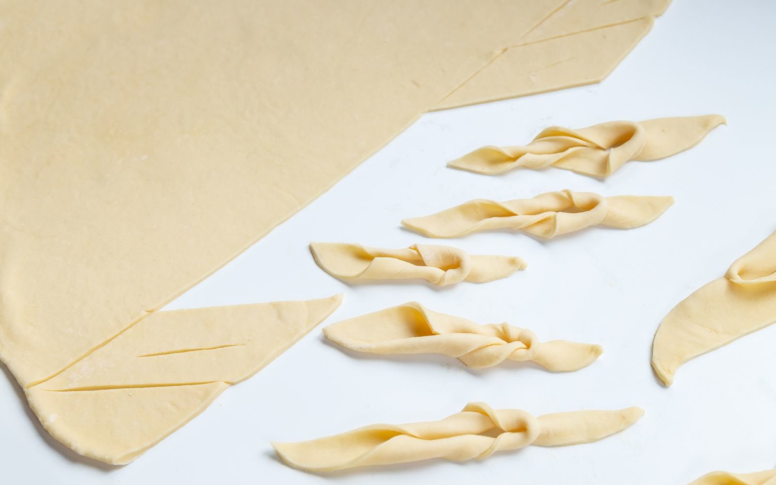 - Разделив тесто на равные части, раскатываем каждую тонким пластом. Нарезаем пласт прямоугольными полосками, используя фигурный нож. Отправляем полоски в кипящий фритюр.