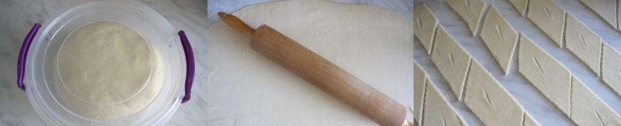 - Нарезаем на прямоугольники, в серединке каждого делаем надрез и переворачиваем через него тесто на другую сторону.