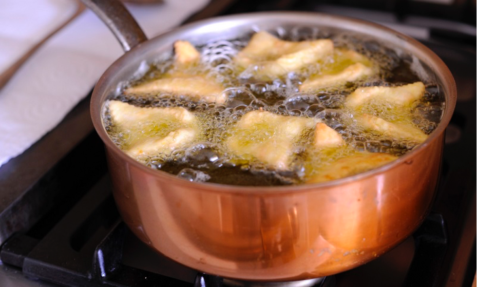 - Нагреваем растительное масло (можно на сковороде или же взять небольшую кастрюлю). Опускаем 2-3 хворостинки и обвариваем их в масле 2-3 мин.