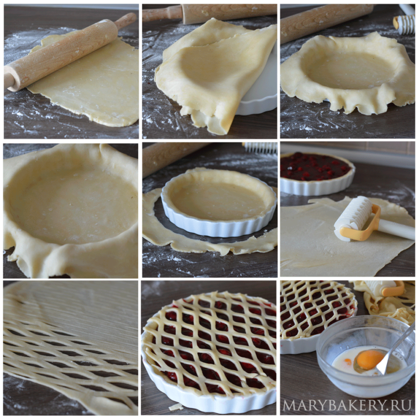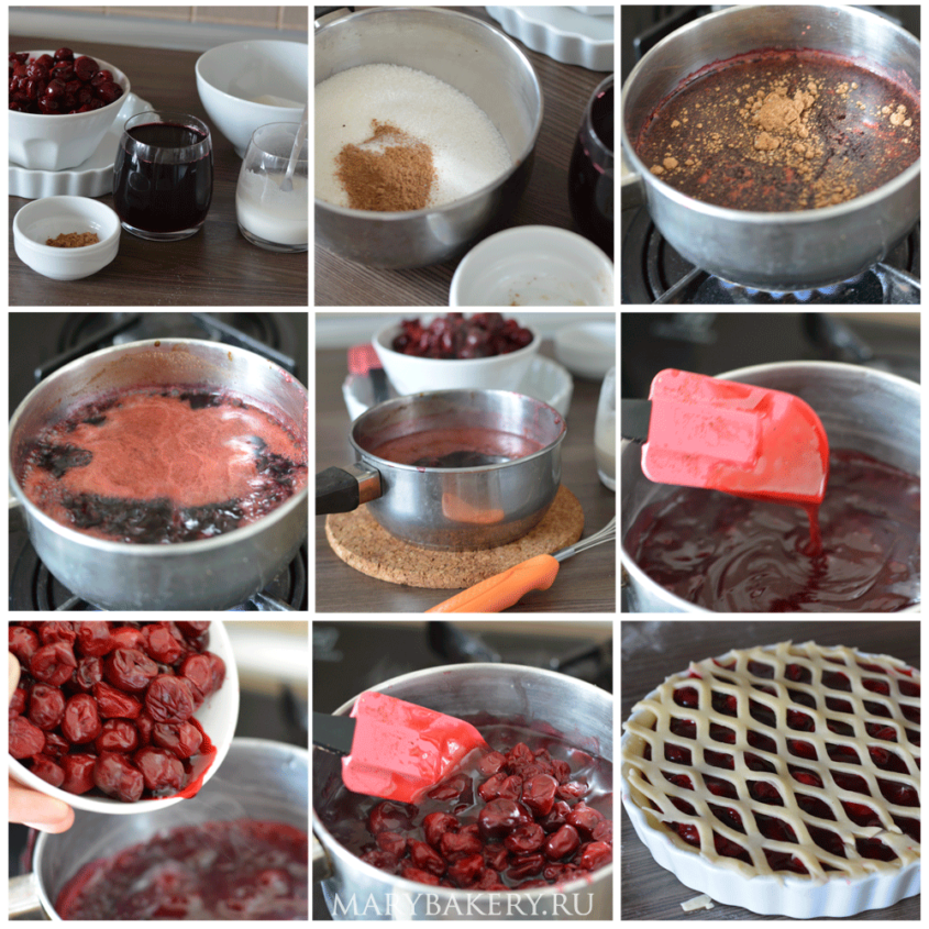 - Пересыпать вишню крахмалом и высыпать в форму на тесто. Равномерно распределить по дну.