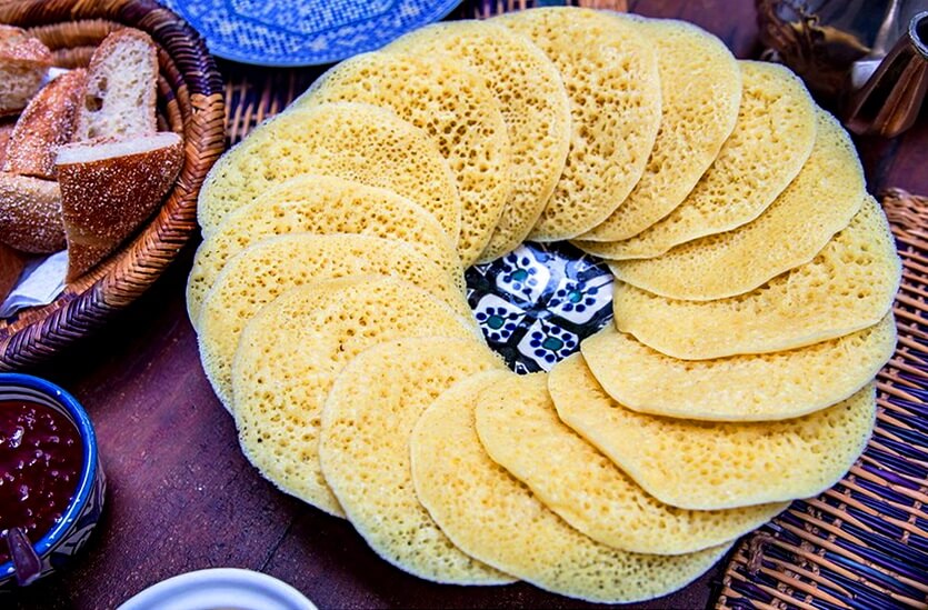 На завтрак, десерт или в качестве перекуса в Марокко советуем попробовать аппетитные ажурные блинчики на основе манки. Они действительно особенные. Конечно, блинчики готовят во многих странах, но марокканский вариант блюда не похож ни на один другой. В тесте нет яиц, манка придает им необычный вкус, а одновременное добавление и дрожжей и разрыхлителя (что вообще-то в кулинарии не принято) делает их воздушными и пышными. Даже жарят блинчики только с одной стороны, чтобы они сохранили текстуру. Подают бегрир с вкуснейшим теплым соусом на основе меда с топленым маслом.