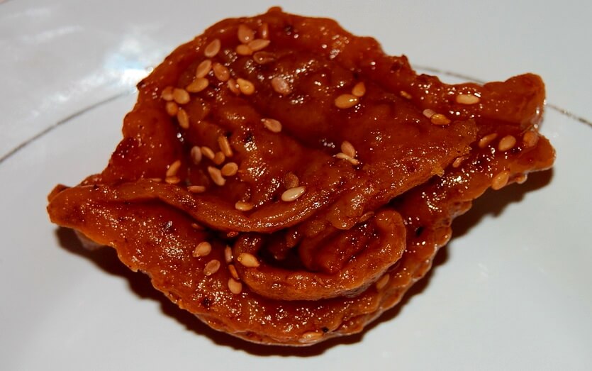 Если вы когда-нибудь пробовали советский «хворост», то примерно представляете себе вкус этой марокканской сладости. Основа – тесто, обжаренное во фритюре до золотистой корочки. Но разница все же есть. У нас его заплетают косичками, а в Марокко обязательно формируют розу. Готовую сладость посыпают не сахарной пудрой, а поливают сиропом на основе розовой воды с медом. Обязательно добавляют кунжут. Не самая полезная для фигуры, но невероятно вкусная сладость – попробуйте, оно того стоит.
