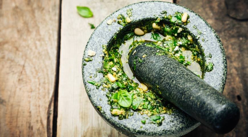 Слово «песто» образовано от итальянского глагола «pestare», что значит «растирать». Идеальным выбором станет металлическая ступка с деревянным пестиком. Если ее на кухне нет, то подойдут удобная миска и деревянная ложка.