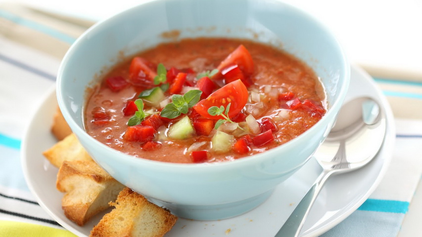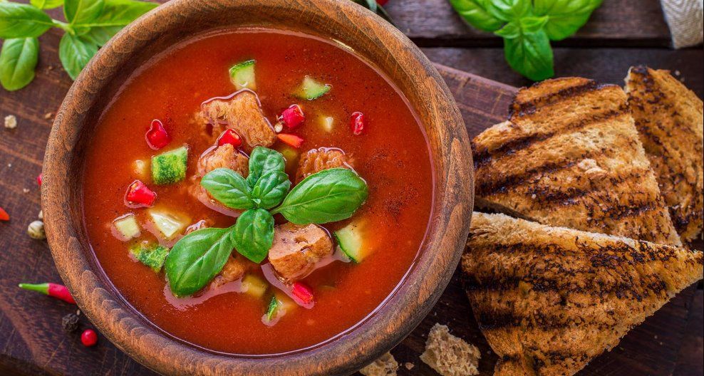 Гаспачо и сальморехо — это супы нежной бархатистой текстуры, которые спасут от жары и скуки на кухне. Готовятся они в блендере и потом охлаждаются в холодильнике. Еще одна порция приправ заставит суп заиграть новыми красками и полностью преобразит вкус гаспачо. До того как в Испанию завезли томаты, суп гаспачо готовили из хлеба, чеснока, уксуса, соли и оливкового масла. Для охлаждения похлебки ее переливали в глиняный горшок, обернутый мокрой тканью.