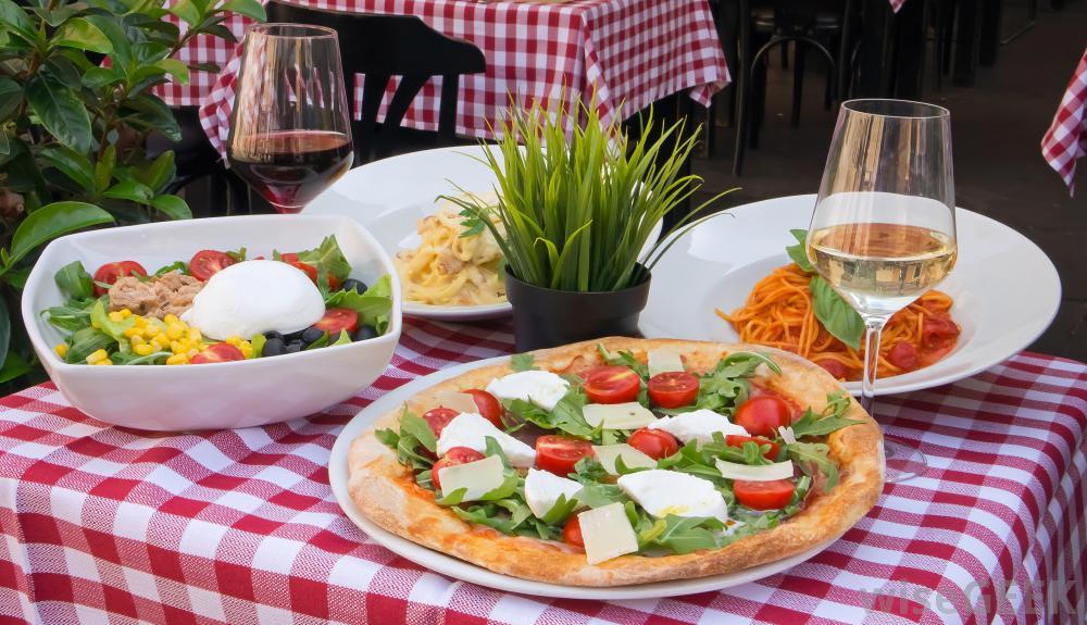 Второй шаг – это меню и декорирование стола. Стоит продумать и основные блюда, и сладкое дополнение к столу, ну и , конечно же, закупить хорошие итальянские вина. В качестве основных блюд могут подойти паста (ведь именно макаронными изделиями славится итальянская кухня), салат «Цезарь», лазанья. Пицца – всем известное итальянское блюдо. Обрадуйте гостей, приготовив ее самостоятельно или заказать пиццу с разными начинками на любой вкус гостей. На столе должно быть фокаччо – ароматный хлеб с сыром.