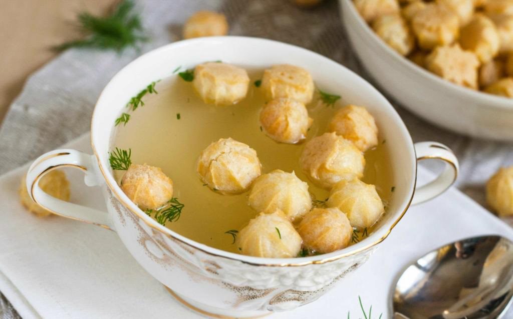 - Чаще всего консоме подают с профитролями (как показано на фото выше). Это такая маленькая выпечка, которая готовится из заварного теста.
