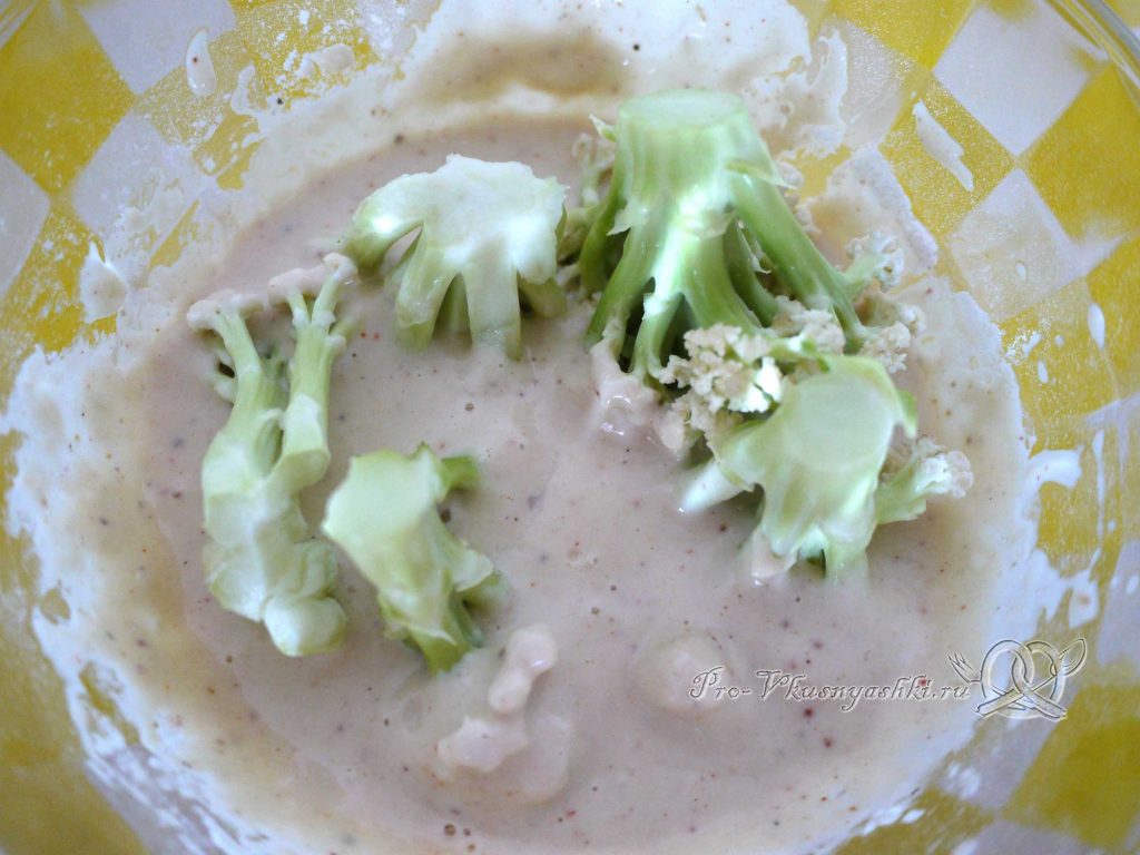 - Соцветие капусты обмокнуть в кляр. Переложить на противень.