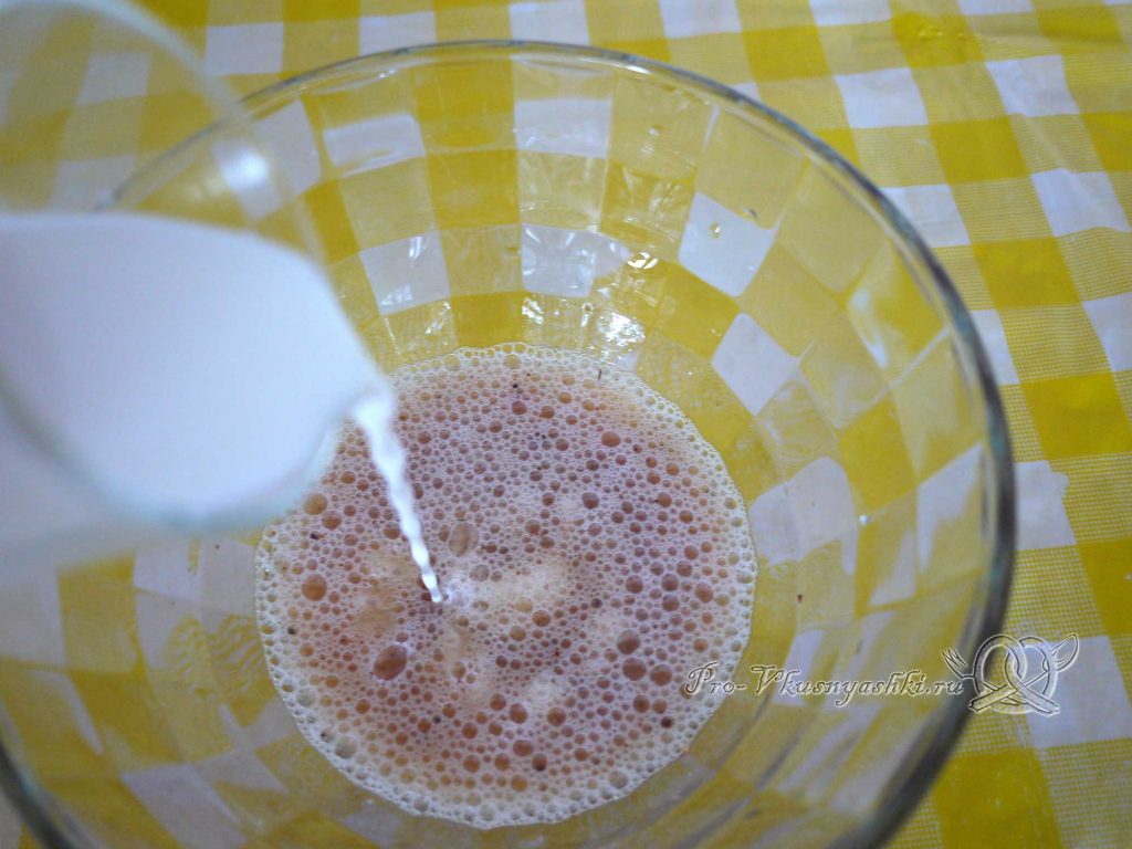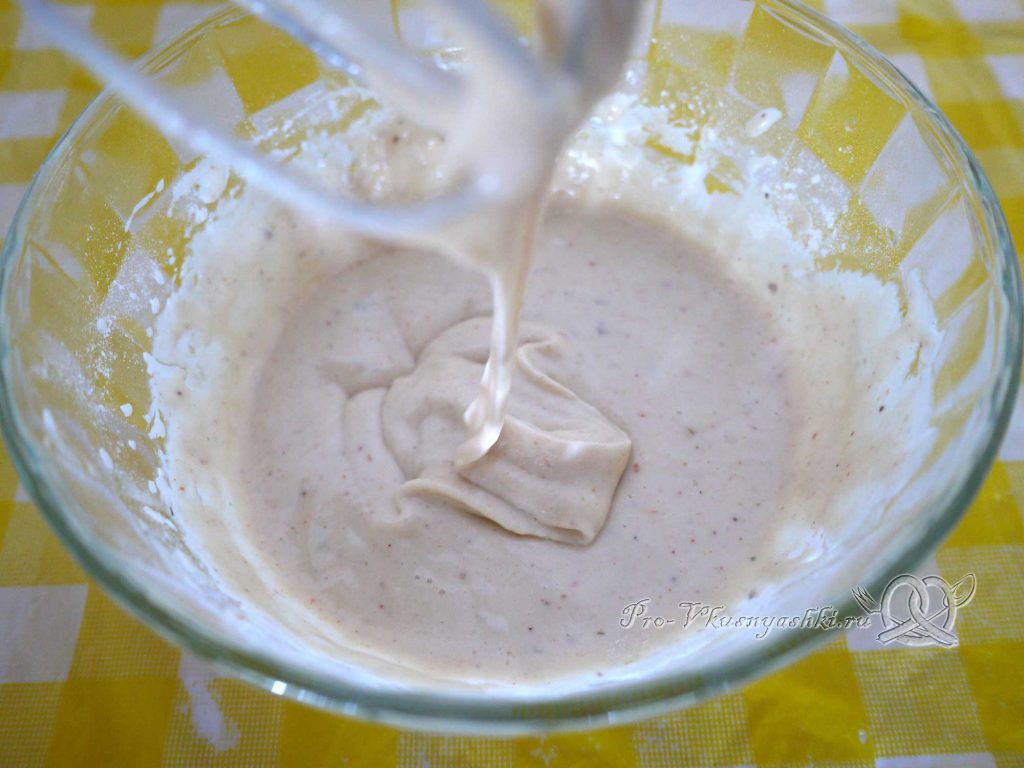 Разболтаем до однородности, и всыпаем и сразу же замешиваем муку. Комочки активно разбиваем, месим до однородности и текучей консистенции примерно как нежирная сметана.