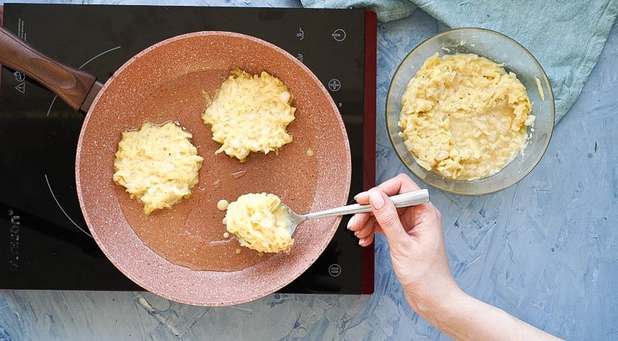 - Раскалить в сковороде растительное масло. Выкладывать в него ложкой порциями получившееся тесто, подравнивая его по форме оладий и немного приплющивая.