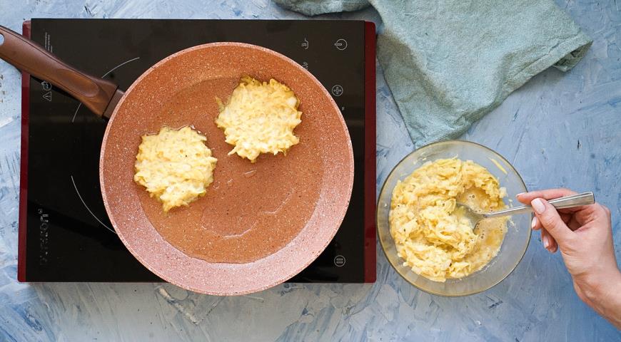 Порционной ложкой выкладываем тесто на разогретую сковородку с маслом. Ждем, когда ободочки подрумянятся, и аккуратно переворачиваем лепешки.