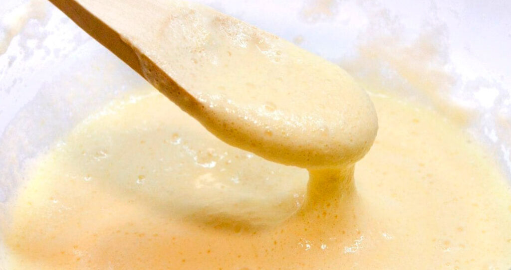 Яйца взбивают до появления пенки. К ним добавляют специи, пряные травы, воду и взбивают в течение минуты. В полученную смесь порциями просеивают муку, перемешивают, чтобы получилась густая, но пышная однородная масса.