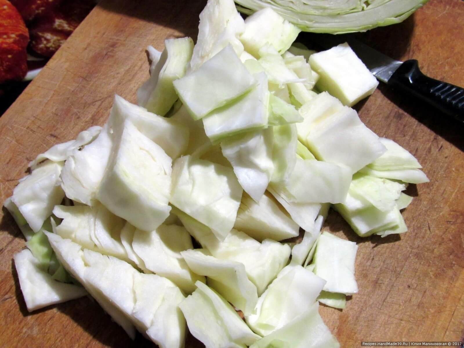 Капусту нарезать квадратиками примерно 2 см на 2 см.