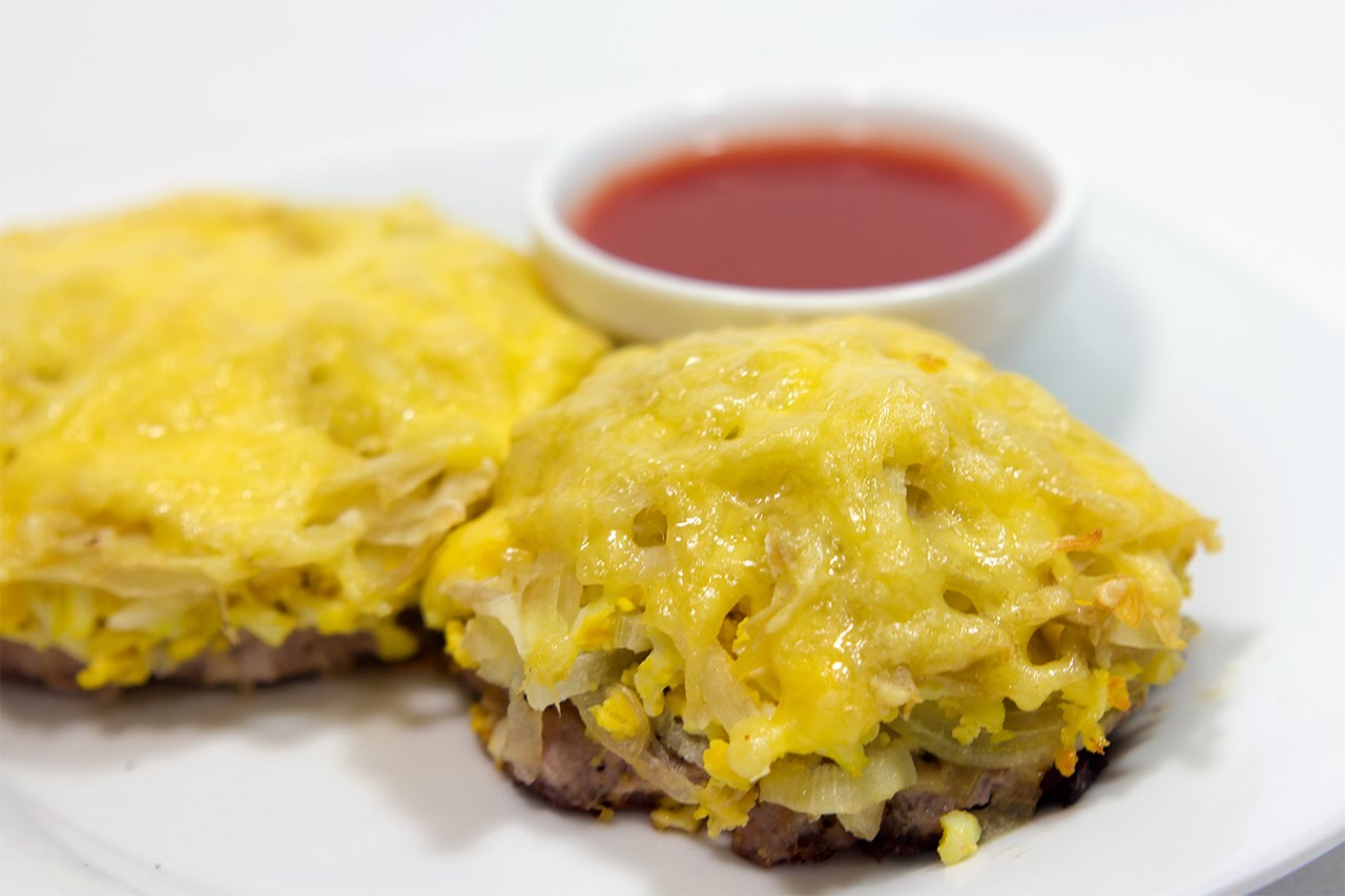 - На каждую котлету выложить лук, яйца, слой картошки.
