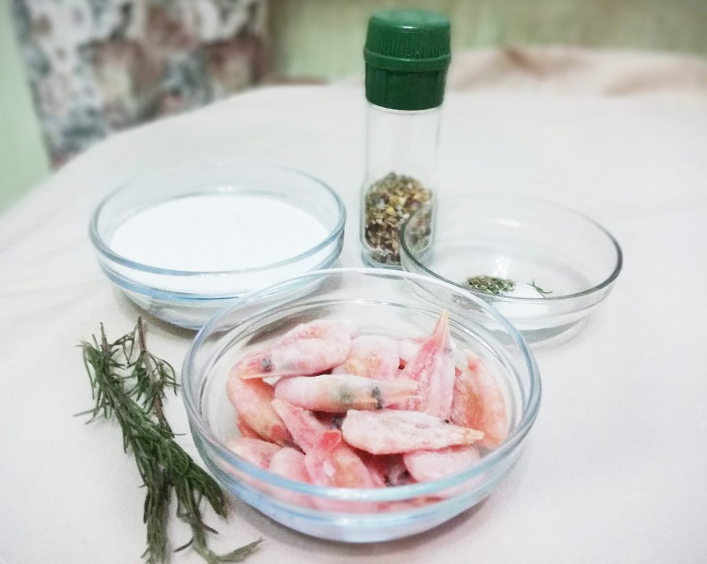 В самом начале мы с вами выберем продукты. Креветки выбирайте так, чтобы не было сильного обледенения, а то качество будет хуже, и количество креветок не обрадует. Я все ингредиенты складываю в отдельные тарелочки или пиалы, чтобы потом не путаться.