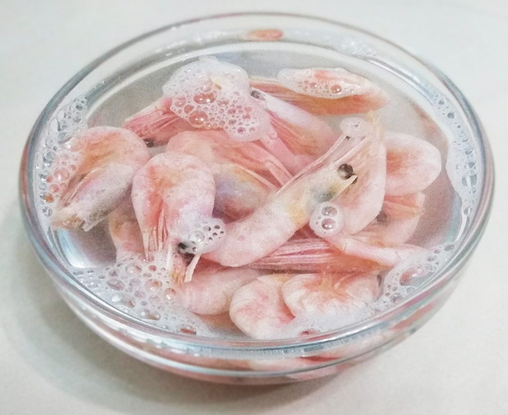 Далее подождать 2-4 минуты и слить кипяток, и подождать пока креветки остынут.
