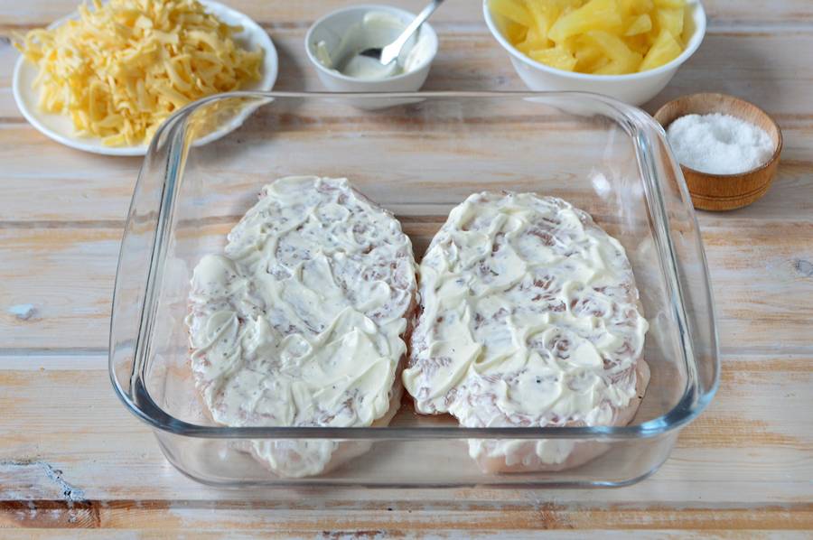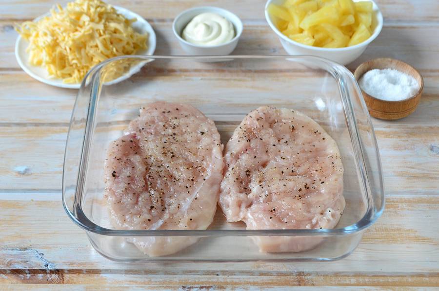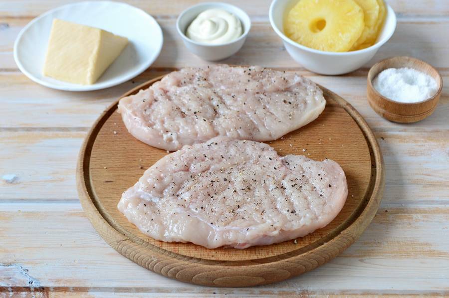 Для начала подготовим куриное филе. Для этого нарежем его на равные куски. Чем тоньше кусочки — тем лучше. Можно их отбить — тогда мясо станет нежнее и быстрее пропечется. Готовые отбивные намажем солью, перцем и смесью приправ, и замаринуем. Замариновать нужно буквально на 20 минут — можно в майонезе, а можно в ананасовом соке.