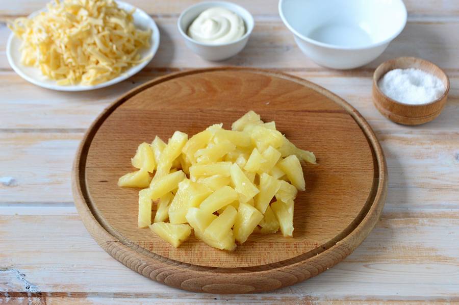 5. Ананасы режем кубиками и выкладываем их на слой курицы.