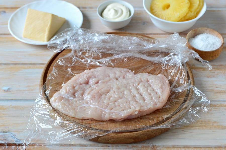 На разделочную доску стелим кусок пищевой пленки, на один ее край кладем филе, накрываем другим краем и бережно (без особых усилий) отбиваем. Пленка не даст мясу порваться под ударами кухонного молотка.