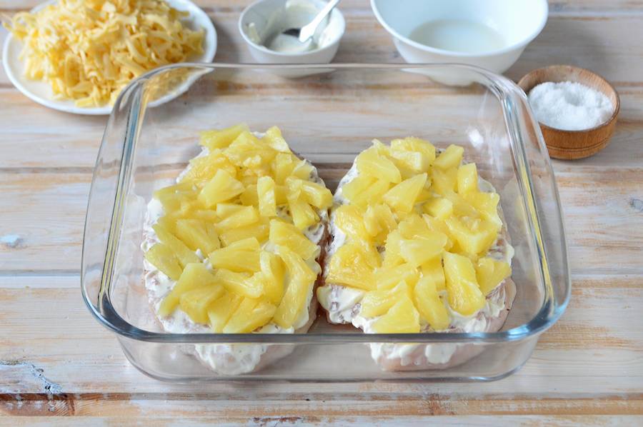 - На ананасы уложите куриное мясо, залейте его остатками подливы.
