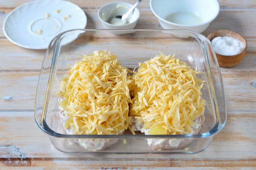 Вот и все! Наш шедевр готов! Отправляйте противень в духовку. Время приготовления — 40 минут. За 10 минут до приготовления достаньте противень с блюдом из духовки и еще раз посыпьте куриное филе с ананасами тертым сыром.