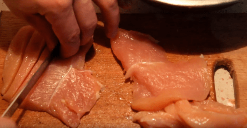 - Кусочки курятины тонко нарезаются и слегка отбиваются. Мясо нужно посолить и поперчить по вкусу.
