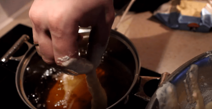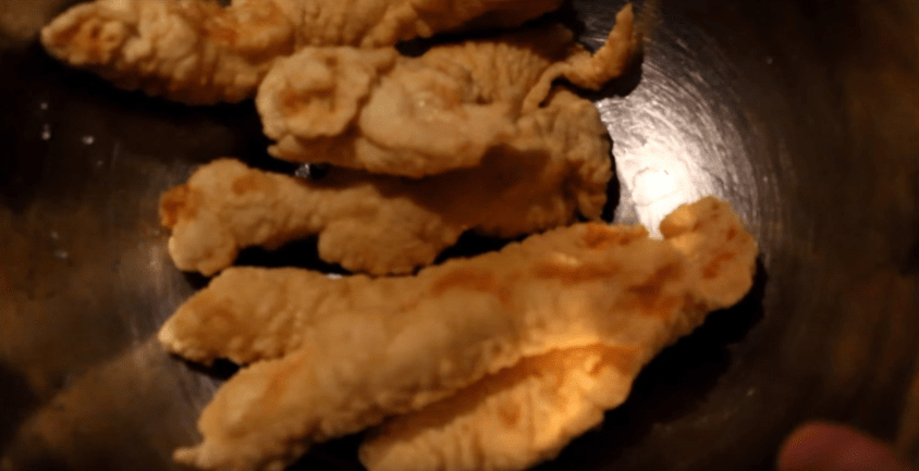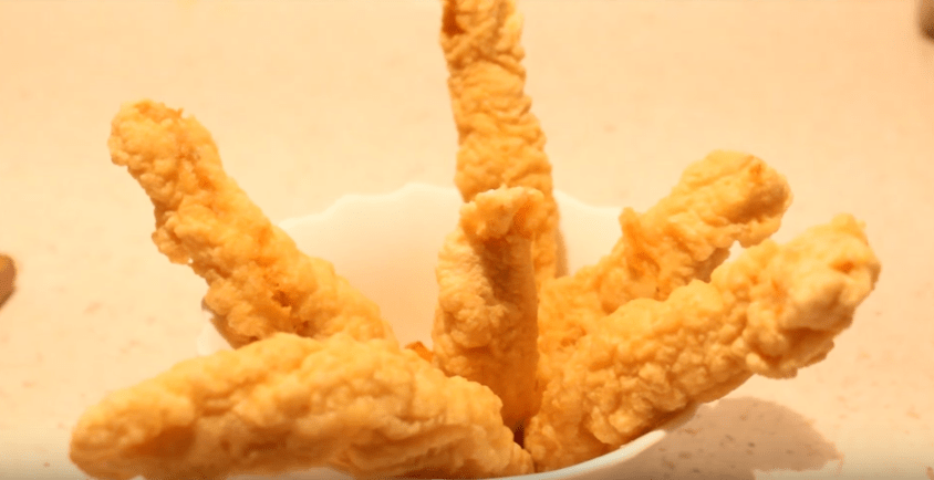 5. Когда кляр станет золотистым, а масло начнет сильно шкворчать, это будет означать, что курица начала пускать сок. С этого момента засекаем одну минуту, после чего достаем получившиеся куриные палочки. На все про все уйдет около 6 минут.