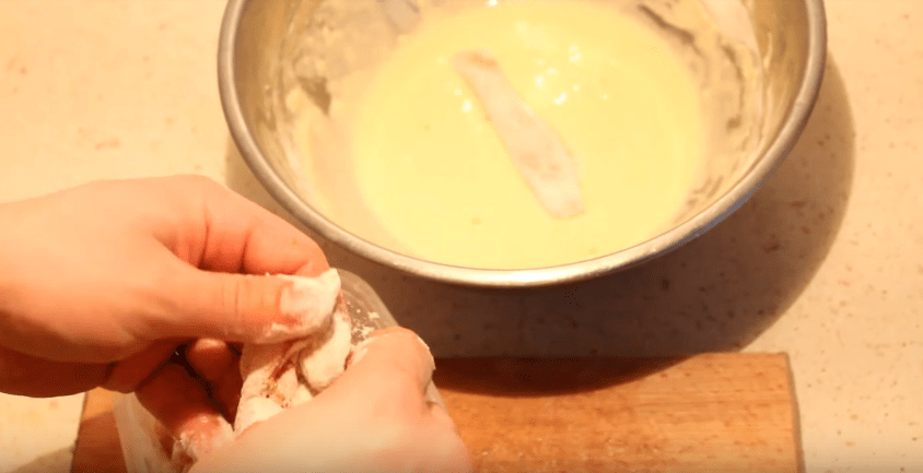 3. Окунаем замаринованное ранее филе в крахмальный кляр.