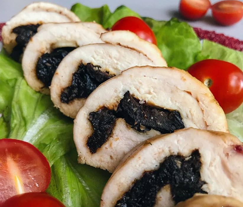 - Далее куриную «лепешку» солим, перчим, распределяем слайсы чеснока. На край кладем чернослив (прежде выдержала в кипятке минут 5) и заворачиваем рулет.