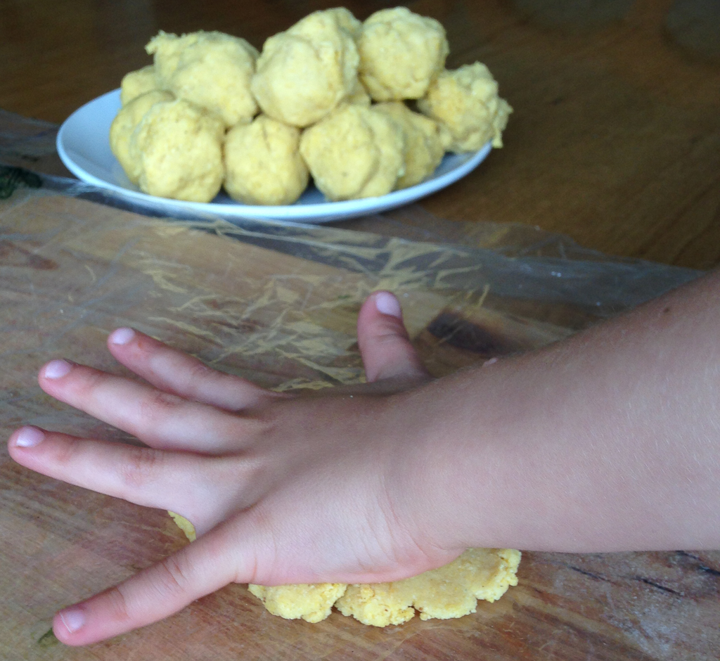 Поднявшееся тесто разделяем на десяток частей, формируем из них шарики, затем расплющиваем в лепёшки и раскладываем по противню. Даём выстояться до двадцати минут.