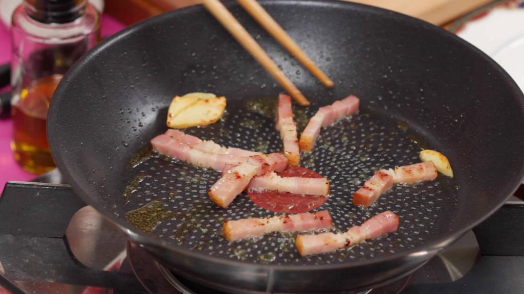 Его режут тонкими полосками или кубиками и поджаривают в небольшом количестве растительного масла. После чего перекладывают из сковороды. Иногда растительное масло дополнительно ароматизируют чесноком. Для этого слегка раздавленные чесночные зубчики поджаривают перед беконом до румяности