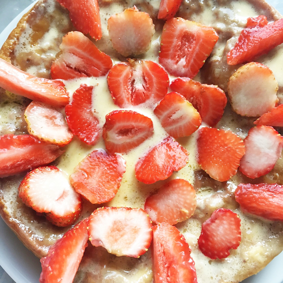 Пропитанный первый корж покрываем толстым слоем крема с кусочками клубники. Накрываем вторым коржом, пропитанный сахарным сиропом. Сверху покрываем всё невесомым, воздушным облаком из йогуртово-сливочного крема. И венец всему ягоды клубники.