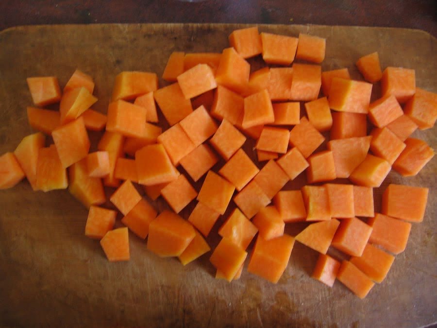 Шаг 1. Очистите тыкву и картофель и нарежьте мелкими кубиками.
