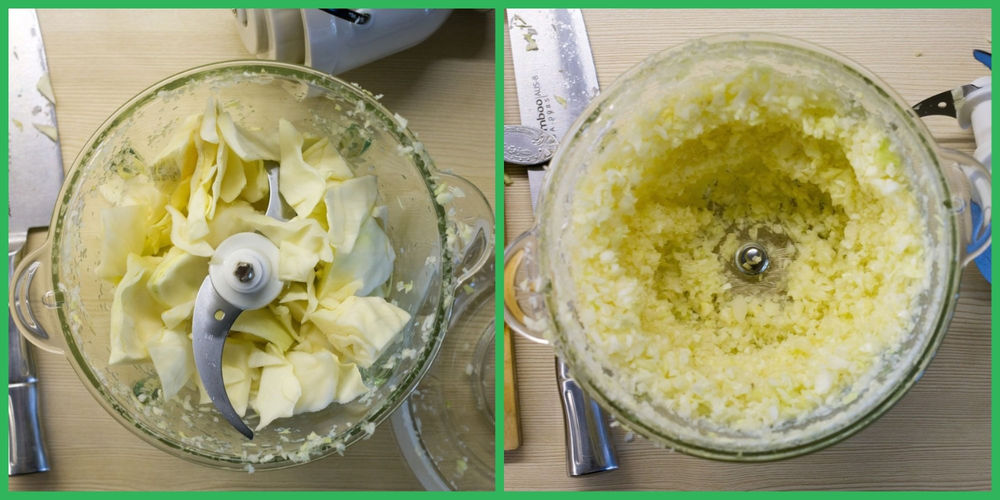 - Для начинки мелко порежьте шесть очищенных картофелин и две небольших луковицы. Посолите и поперчите продукты.
