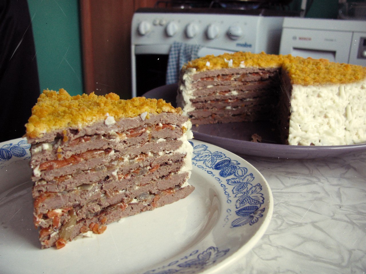 Приготовить такое блюдо не составит никакого труда. Подавать закусочный торт можно в качестве полноценного завтрака, ужина или как закуску на праздничное застолье.