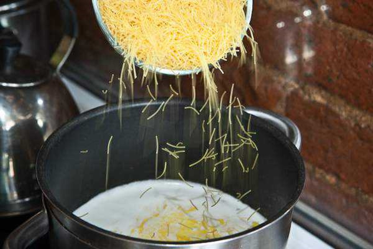 - Повсевременно помешивая молочную смесь, отправляем в нее 75-100 г вермишели.