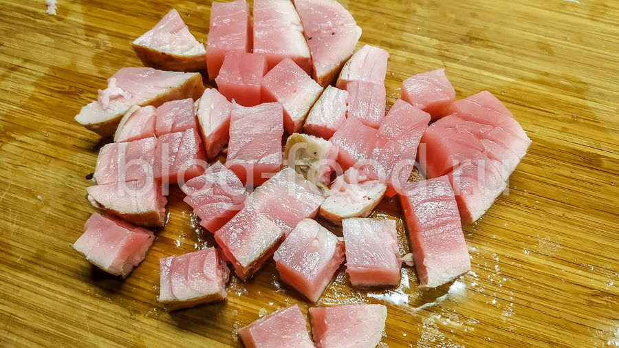 2. С консервированного тунца слить жидкость и размять его вилкой не очень сильно, чтобы остались оформленные кусочки.