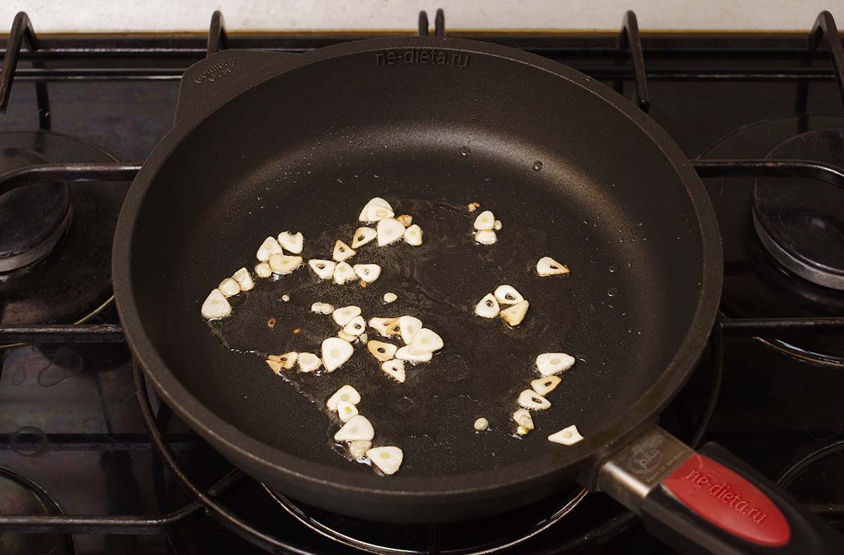 3. В сковороде разогреть оливковое масло, выложить чеснок и готовить 2 – 3 минуты на среднем огне до легкого подрумянивания и появления сильного аромата.
