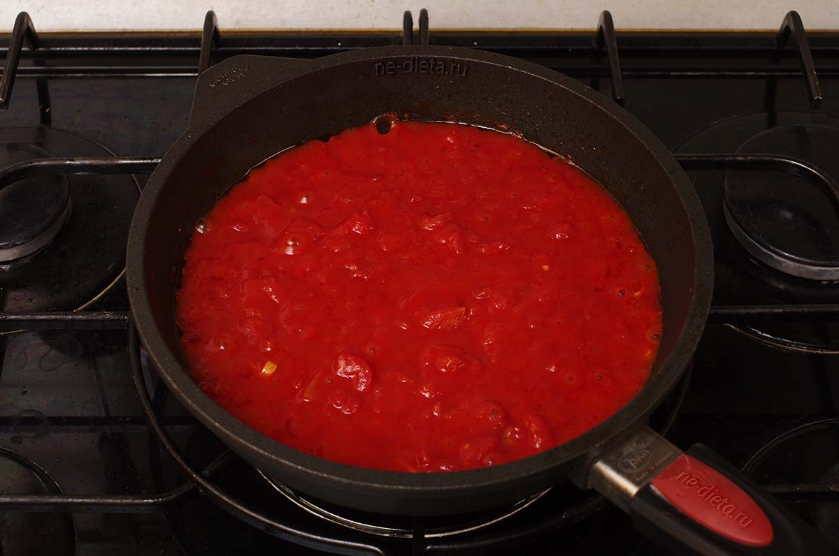 2. Добавляем томаты. Консервированные томаты прямо из банки выворачиваем на сковородку. У меня были мороженные черри. С них нужно снять шкурку. С замороженных томатов она снимается очень легко. Под струей еле теплой воды снимаем ее пальцами. Так вот, я очистила мини-томаты от шкурки и отправила на сковородку. Увеличиваем огонь, даем такому соусу немного протушиться, томаты нужно подавить ложкой, а можно вилкой, а у меня они и этого не требовали, я просто перемешала соус.