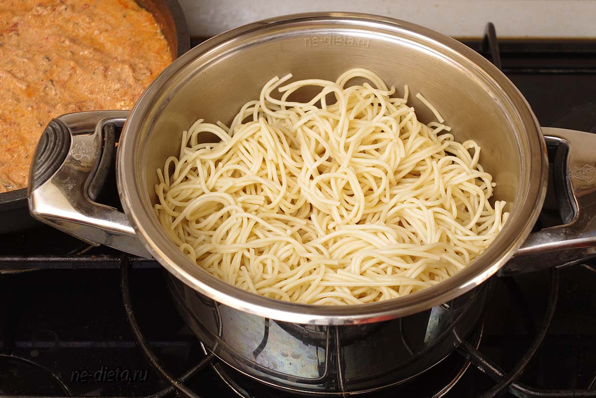 - Спагетти отвариваем в подсоленной воде до готовности. Ориентируемся на время, указанное на упаковке. Жидкость сливаем.