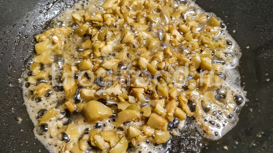 - Выложить к обжаренному луку, перцу и чесноку и ещё раз обжарить.